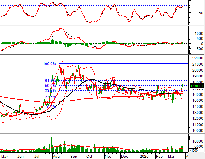 Hiện giá cổ phiếu đang kiểm tra lại ngưỡng Fibonacci Retracement 50% (tương đương vùng 17,200-17,700). Nếu các tín hiệu tích cực tiếp tục ủng hộ thì triển vọng phục hồi sẽ được bền vững hơn.