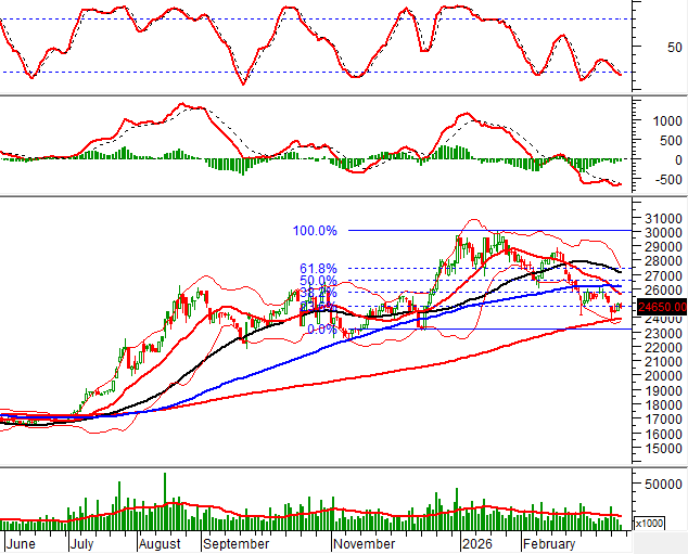 Hiện tại, giá cổ phiếu tiếp tục được nâng đỡ bởi đường SMA 200 ngày và đang kiểm tra lại ngưỡng Fibonacci Retracement 23.6% (tương đương vùng 24,500-25,000).