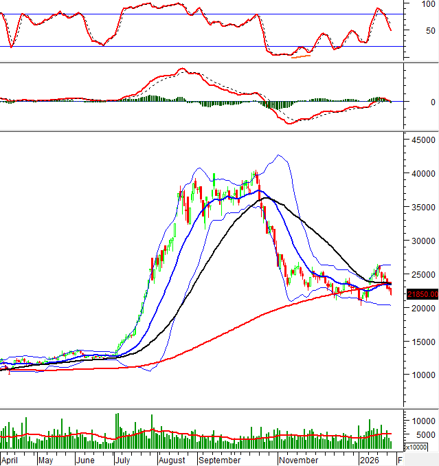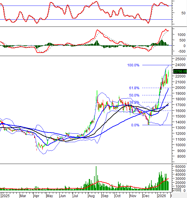 Thêm vào đó, giao cắt vàng (Golden Cross) giữa đường SMA 50 ngày và SMA 100 ngày đã hình thành càng ủng hộ thêm cho xu hướng tăng ngắn hạn. Trong kịch bản tích cực giá của BSR có thể tiến đến ngưỡng Fibonacci Projection 100% (tương đương vùng 23,700-24,300).