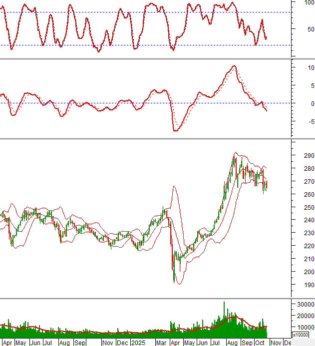Tuy nhiên, giá cổ phiếu này tiếp tục bám sát dải dưới (Lower Band) của Bollinger Bands trong khi chỉ báo MACD liên tục tạo các đỉnh và đáy mới thấp hơn (Lower High, Lower Low). Điều này cho thấy triển vọng tiêu cực trong ngắn hạn vẫn đang hiện hữu.
