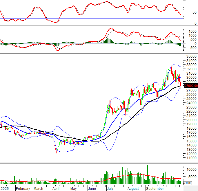 Trong phiên giao dịch sáng ngày 28/10/2025, HNX-Index đang ở trong trạng thái nguy hiểm khi liên tục nằm dưới Middle của Bollinger Bands.