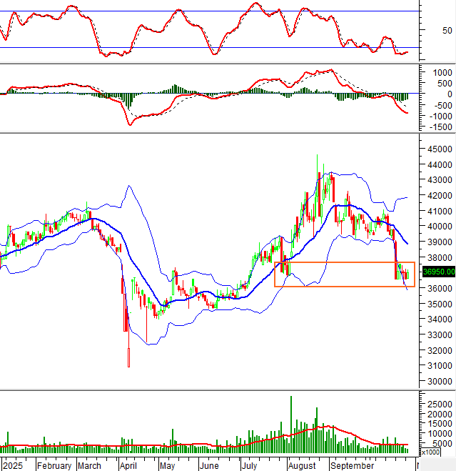 Giá của BID đang kiểm tra lại đáy cũ tháng 08/2025 (tương đương vùng 36,000-37,600) với khối lượng liên tục nằm dưới mức trung bình 20 ngày trong các phiên gần đây.