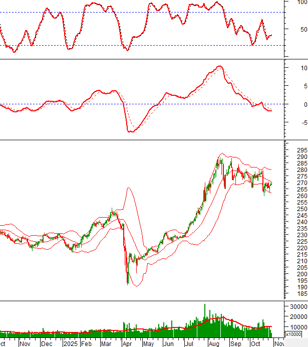 Trong phiên giao dịch sáng ngày 30/10/2025, HNX-Index tăng nhẹ và xuất hiện mẫu hình nến Long Upper Shadow cho thấy áp lực bán ra khá mạnh khi đến gần Middle của Bollinger Bands (tương đương vùng 270-271 điểm).