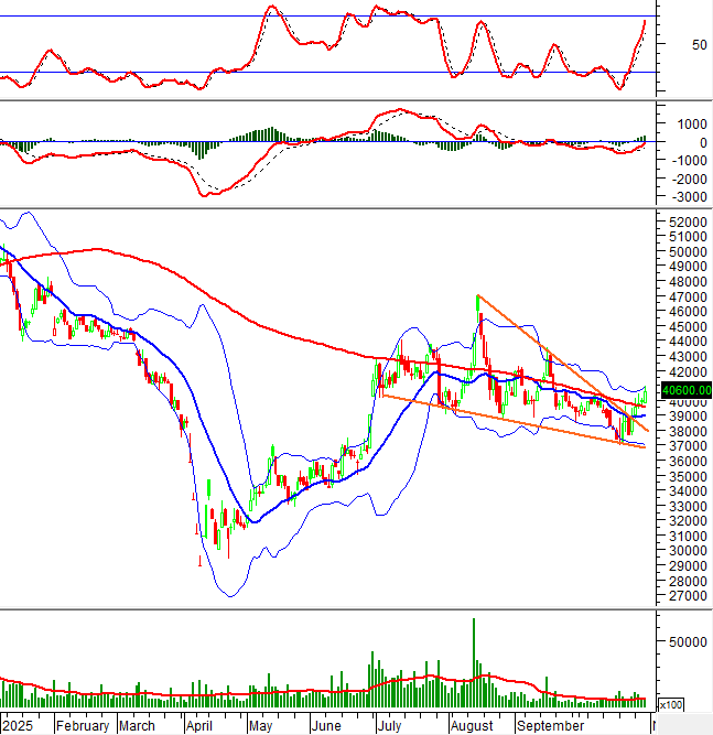 Thêm vào đó, giá cổ phiếu này đang bám sát dải trên (Upper Band) của Bollinger Bands trong khi chỉ báo MACD tiếp tục tăng và đã cắt lên mức 0 sau khi cho tín hiệu mua.
