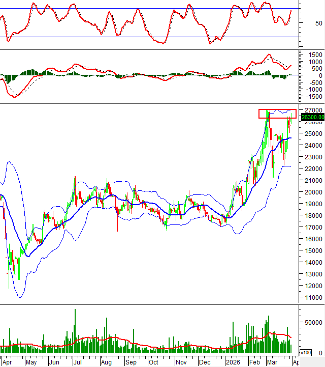 Hiện tại, giá đang kiểm tra đỉnh cũ đầu tháng 3/2026 (tương đương vùng 26,200-27,000) trong khi chỉ báo MACD tiếp tục tăng và nằm trên mức 0 sau khi cho tín hiệu mua trở lại. Nếu tình hình tiếp tục được cải thiện thì xu hướng tăng trong ngắn hạn sẽ bền vững hơn.