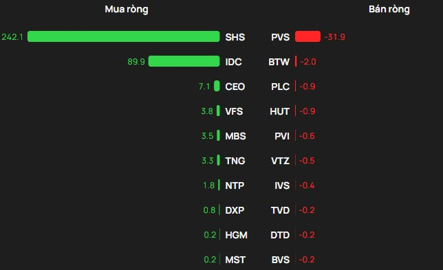 Ở chiều mua, khối ngoại mua ròng mạnh nhất tại SHS với khoảng 242 tỷ đồng, bỏ xa các mã đứng sau là IDC (90 tỷ đồng), CEO (7 tỷ đồng), VFS (4 tỷ đồng) và MBS (4 tỷ đồng).