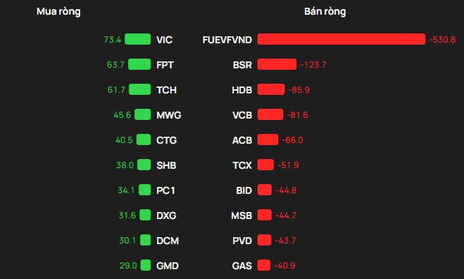 Ở chiều ngược lại, áp lực bán ròng tập trung mạnh nhất tại CCQ FUEVFVND với giá trị khoảng 531 tỷ đồng, theo sau là BSR (-124 tỷ đồng), HDB (-86 tỷ đồng), VCB (-82 tỷ đồng) và ACB (-66 tỷ đồng).