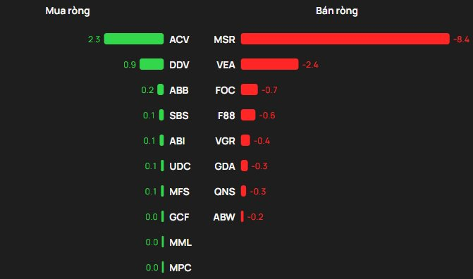 Ở chiều ngược lại, MSR bị bán ròng mạnh nhất với giá trị khoảng 8 tỷ đồng, theo sau là VEA (-2 tỷ đồng), FOC (-1 tỷ đồng), F88 (-1 tỷ đồng) và VGR (-0,4 tỷ đồng).
