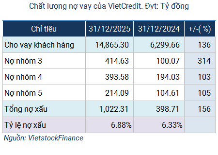 Tính đến cuối năm 2025, tổng tài sản VietCredit đạt gần 18 ngàn tỷ đồng, gấp 2.2 lần đầu năm. Trong đó, dư nợ cho vay khách hàng gần 14.9 ngàn tỷ đồng, gấp 2.4 lần; tiền gửi tại tổ chức tín dụng gần 3 ngàn tỷ đồng, tăng 80%. Về huy động, tiền gửi của khách hàng đạt gần 2.5 ngàn tỷ đồng và giấy tờ có giá hơn 6 ngàn tỷ đồng, lần lượt gấp 2.7 lần và 2.6 lần đầu năm.