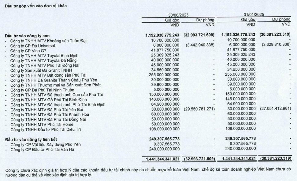 Tính đến thời điểm 30/06/2025 trên BCTC riêng soát xét bán niên, PTB có 19 công ty con, hoạt động trong các lĩnh vực khai thác, sản xuất, kinh doanh, chế biến đá, gỗ; mua bán, sửa chữa xe ô tô; kinh doanh bất động sản. Tổng giá gốc đầu tư hơn 1,192 tỷ đồng, tuy nhiên đang phải trích dự phòng gần 33 tỷ đồng tại Công ty TNHH MTV Đá Phú Tài Yên Bái và CTCP Đá Universal. Công ty cũng đầu tư vào 2 công ty liên kết, giá trị hơn 249 tỷ đồng.
