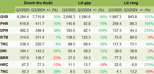 HRC, DPR và PHR tăng trưởng lãi ròng ấn tượng nhất ngành nói chung và nhóm GVR nói riêng. Dù vậy, mỗi doanh nghiệp lại có câu chuyện khác biệt.
