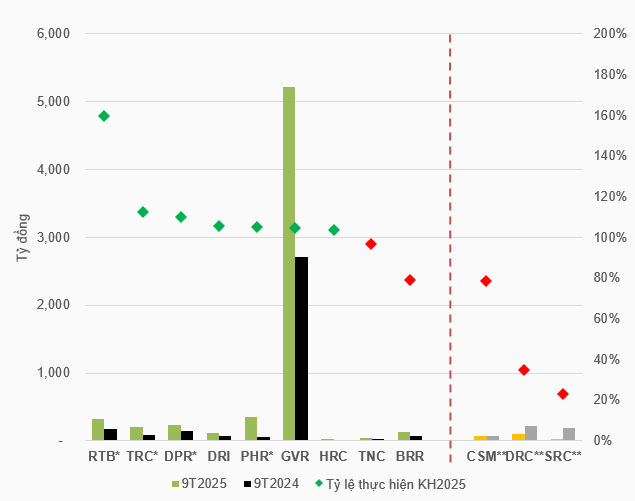 Lũy kế 9 tháng đầu 2025, phần đông doanh nghiệp ngành cao su thiên nhiên đã sớm vượt kế hoạch lợi nhuận cả năm. Đứng đầu là RTB vượt 60%, tiếp theo là TRC vượt 13% và DPR vượt 10%. Loạt cái tên khác vượt nhẹ kế hoạch sớm 1 quý, bao gồm DRI, PHR, GVR và HRC. Trong khi đó, TNC và BRR cũng tiến gần đến việc hoàn thành mục tiêu, với tỷ lệ thực hiện lần lượt 97% và 79%.