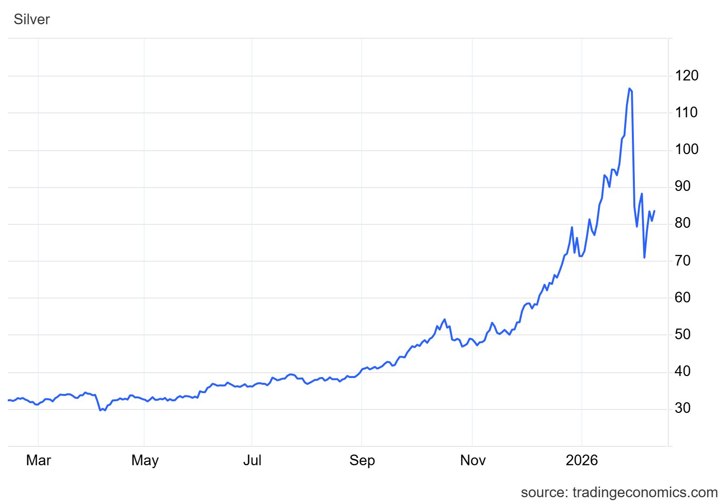 Trên thị trường thế giới, giá bạc vẫn đang diễn biến rung lắc mạnh sau cú rơi từ đỉnh lịch sử. Đóng cửa phiên 10/2, giá bạc thế giới quay đầu giảm 3,1% xuống mức 80,8 USD/ounce. Sang tới hôm nay, tính đến 14h40 ngày 11/2 (giờ Việt Nam), giá bạc giao ngay hồi phục lại lên mốc 83,5 – 83,6 USD/ounce, tăng khoảng 2,8 USD/ounce (+3,5%) so với đầu phiên. Hiện giá bạc thấp hơn khoảng 28% so với mức đỉnh ngày 29/1.