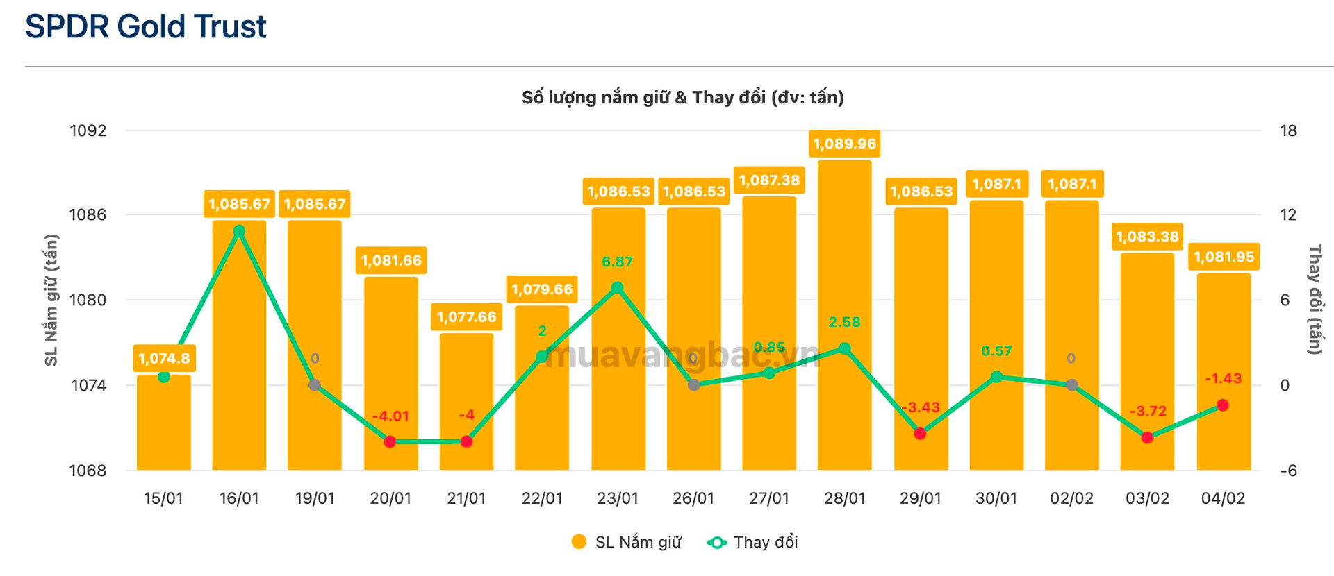 Theo cập nhật mới nhất từ muavangbac.vn, quỹ vàng lớn nhất thế giới SPDR Gold Trust tiếp tục bán ròng hơn 1,4 tấn vàng trong ngày 4/2. Tổng lượng vàng nắm giữ của quỹ ghi nhận gần 1.082 tấn.