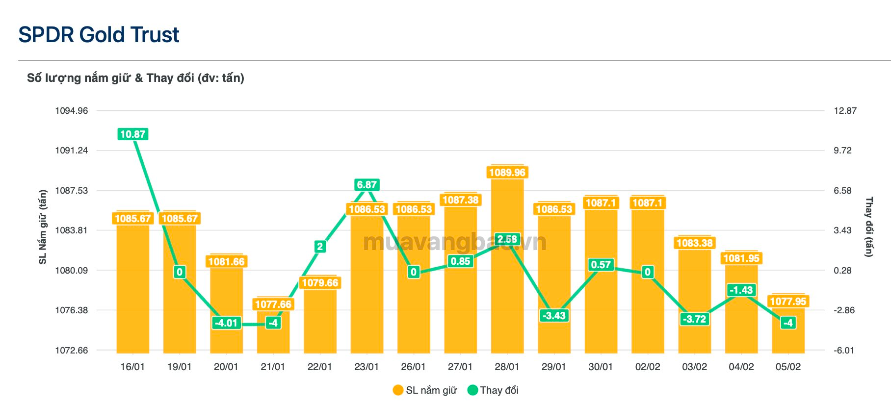 Theo dữ liệu từ muavangbac.vn, quỹ ETF vàng lớn nhất thế giới SPDR Gold Shares tiếp tục bán ra 4 tấn vàng trong phiên 5/2, qua đó hạ lượng nắm giữ xuống còn hơn 1.077 tấn. Đây là phiên thứ ba liên tiếp quỹ này xả hàng, nâng tổng lượng bán ròng trong 3 phiên gần nhất lên gần 10 tấn.