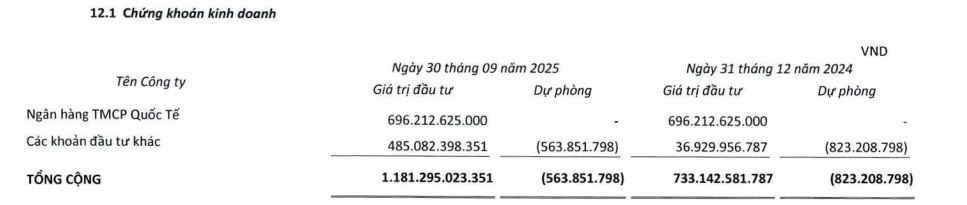 Khoản đầu tư chứng khoán của REE tăng mạnh lên gần 1.2 ngàn tỷ đồng, hơn đầu năm 61%. Mức tăng chủ yếu từ các khoản mục đầu tư khác lên tới 485 tỷ đồng (đầu năm chỉ 37 tỷ đồng). Đáng nói, khoản này tại cuối quý 2 chỉ 237 tỷ đồng, có nghĩa REE đã rót thêm 248 tỷ đồng vào thị trường trong quý 3. Khoản này vẫn đang lỗ 564 triệu đồng, giảm so với mức lỗ 823 triệu đồng hồi đầu năm.
