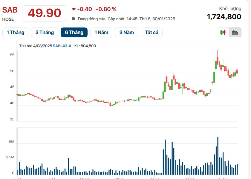 Trên thị trường chứng khoán, kết thúc phiên giao dịch ngày 30/01/2026, thị giá SAB đóng cửa ở mức 49.900 đồng/cp với khối lượng giao dịch đạt hơn 1,72 triệu đơn vị.