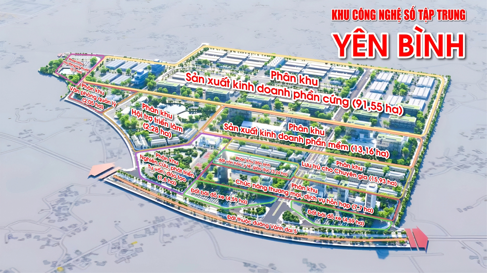 Phối cảnh các phân khu chức năng chính và phụ trợ của khu công nghệ số tập trung Yên Bình. Nguồn: SGR