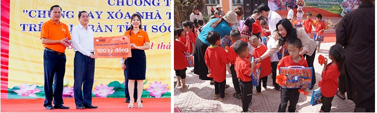 Bên cạnh đó, SHB tích cực tham gia các chương trình an sinh xã hội: tài trợ giáo dục, y tế, xây dựng hạ tầng, đồng hành trong các dự án xóa đói giảm nghèo bền vững. Những hoạt động này góp phần khẳng định hình ảnh SHB là một “doanh nghiệp công dân” – không chỉ kinh doanh mà còn gắn bó chặt chẽ với đời sống cộng đồng. Năm qua, SHB dành hơn 150 tỷ đồng cho các hoạt động an sinh xã hội, trong đó hơn 100 tỷ đồng trao tới tỉnh Sóc Trắng (nay thuộc TP Cần Thơ). Ngân hàng vinh dự được nhận bằng khen của Thủ tướng vì những đóng góp tích cực trong chương trình xóa nhà tạm, dột nát.