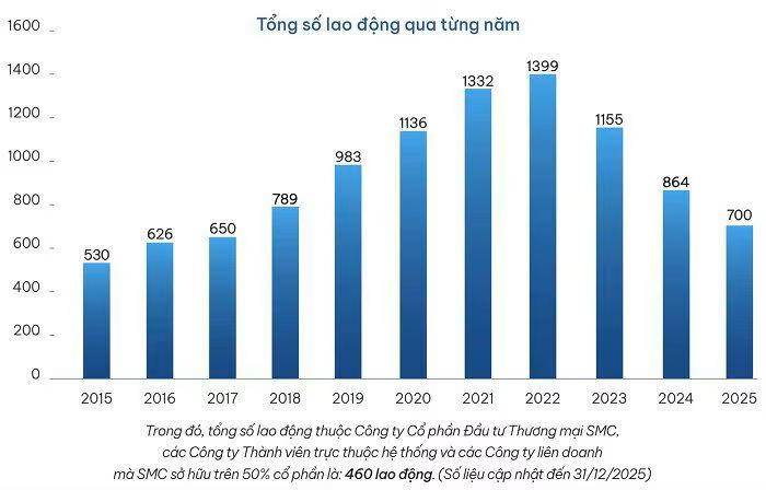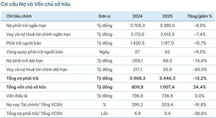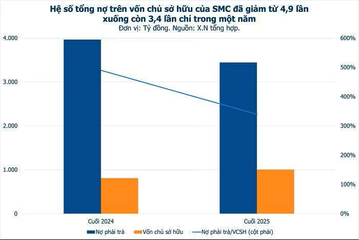 Trên thực tế, quá trình giảm đòn bẩy đã bắt đầu từ năm trước. Theo báo cáo thường niên, tổng nợ phải trả của SMC giảm từ 3.968 tỷ đồng xuống 3.446 tỷ đồng vào cuối năm 2025, trong khi vốn chủ sở hữu tăng từ 809 tỷ đồng lên 1.007 tỷ đồng. Nhờ đó, hệ số tổng nợ trên vốn chủ sở hữu giảm từ 4,9 lần xuống 3,4 lần chỉ trong một năm.