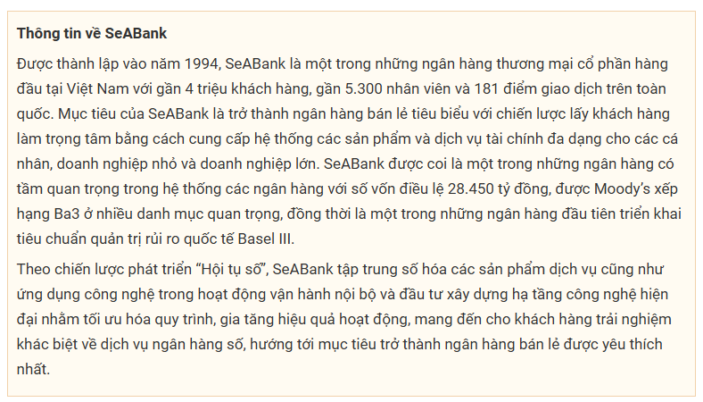 Stability – An toàn & Bền vững: Mọi quyết định tài chính được đảm bảo bởi nền tảng vững mạnh và uy tín của SeABank, là ngân hàng được Moody’s xếp hạng tín nhiệm Ba3, triển vọng ổn định.