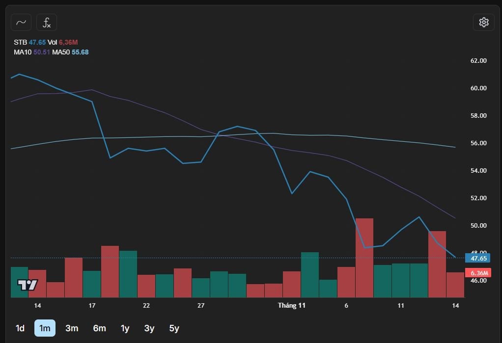 Cổ phiếu STB của Ngân hàng TMCP Sài Gòn Thương Tín (Sacombank) vừa có cú sụt giảm mạnh từ mức đỉnh 60.000 đồng/cổ phiếu về còn quanh 48.000 đồng/cổ phiếu chỉ trong khoảng 1 tháng qua.