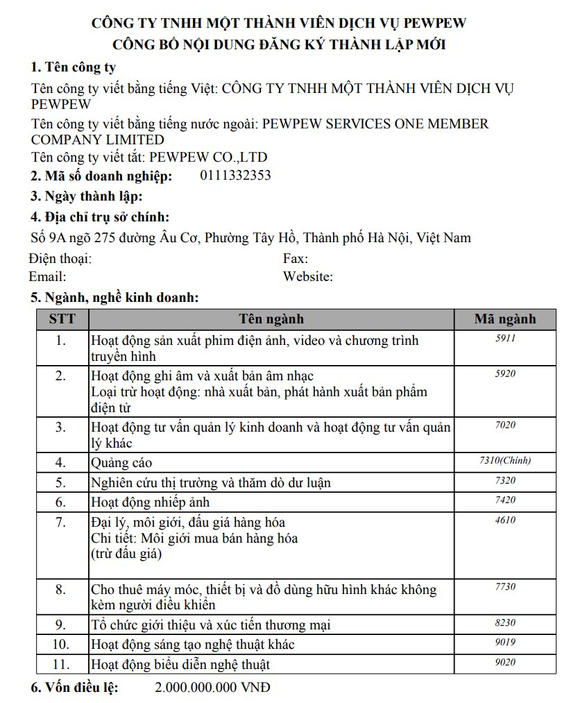 Ông Hoàng Văn Khoa, thường được biết đến là streamer PewPew, vừa thành lập Công ty TNHH MTV Dịch vụ PewPew. Hoàng Văn Khoa, sinh năm 1991, là Tổng giám đốc và người đại diện pháp luật của công ty.