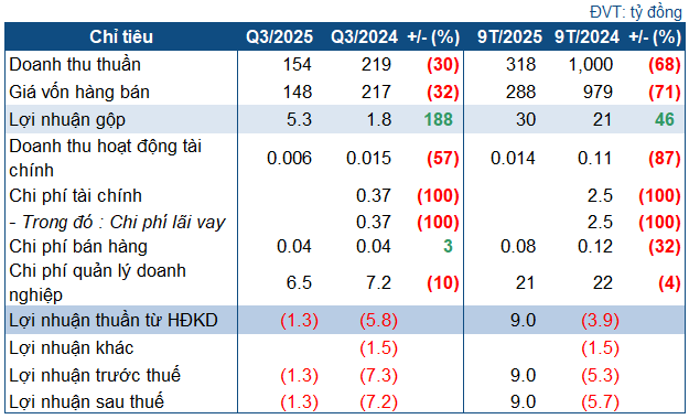 Lũy kế 9 tháng đầu năm 2025, doanh thu thuần sụt giảm 58% so với cùng kỳ, chỉ đạt 318 tỷ đồng; lãi ròng gần 9 tỷ đồng (cùng kỳ lỗ 5.7 tỷ đồng). So với kế hoạch được ĐHĐCĐ 2025 thông qua, Doanh nghiệp thực hiện được 37% mục tiêu doanh thu, nhưng vượt tới 264% kế hoạch lãi sau thuế cả năm.