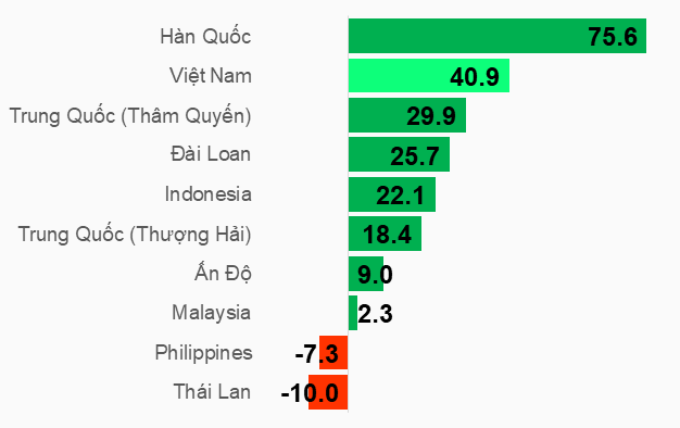 So sánh được thực hiện giữa thị trường của các quốc gia nổi bật trong khu vực. VN-Index của Việt Nam tăng ấn tượng, nhưng có điểm trừ là đà tăng tập trung cao vào số ít cổ phiếu