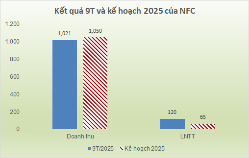 Lũy kế 9 tháng đầu năm, NFC ghi nhận doanh thu thuần gần 1,021 tỷ đồng và lãi sau thuế 94 tỷ đồng, lần lượt tăng 35% và 181% so với cùng kỳ 2024. So với kế hoạch từ ĐHĐCĐ 2025, Doanh nghiệp gần hoàn thành kế hoạch doanh thu với 97% và vượt 84% mục tiêu lãi trước thuế cả năm.