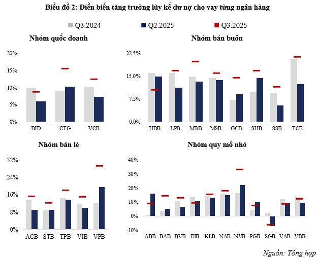 Dù vẫn đạt mức tăng trưởng tích cực, tốc độ mở rộng tín dụng của nhóm bán buôn đã có dấu hiệu chậm lại so với quý trước, trong khi các ngân hàng quy mô nhỏ cũng chứng kiến đà tăng trưởng yếu đi, với mức tích lũy khoảng 13.6% trong quý 3. Nhìn tổng thể, các diễn biến phần nào phản ánh những định hướng đã được nêu tại kỳ đại hội đồng cổ đông đầu năm, khi việc phân bổ room tín dụng đều xoay quanh về nhóm ngân hàng bán lẻ. Điều đó cho thấy kỳ vọng tín dụng dịch chuyển theo hướng hỗ trợ cầu nội địa, góp phần duy trì đà phục hồi tăng trưởng kinh tế.