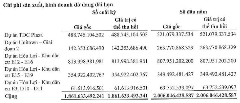 Chi phí sản xuất, kinh doanh dở dang dài hạn gần 1,862 tỷ đồng, giảm 7%, tập trung lớn tại dự án Hòa Lợi – khu dân cư E12 – E16 gần 814 tỷ đồng, khu nhà ở TDC Plaza gần 489 tỷ đồng.