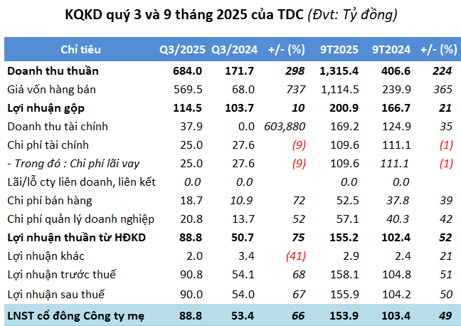 Kết thúc quý 3, TDC ghi nhận doanh thu thuần 684 tỷ đồng, gấp 4 lần cùng kỳ. Tuy nhiên, giá vốn tăng cao nên lãi gộp còn gần 115 tỷ đồng, tăng 10%. Biên lãi gộp co hẹp từ 60% về gần 17%.