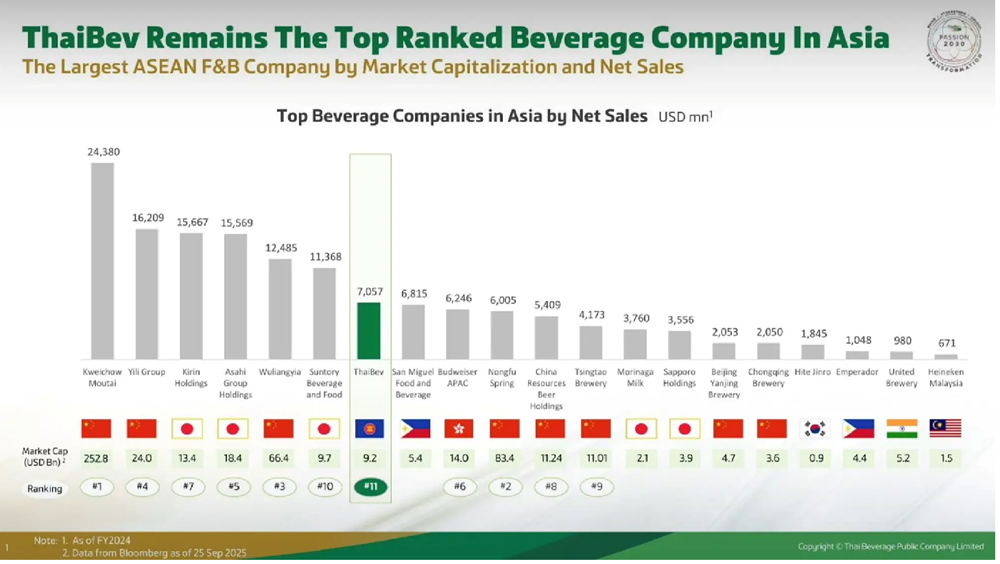 ThaiBev vẫn là công ty đồ uống thuộc top đầu châu Á khi xét theo doanh thu thuần (tính theo triệu USD), kèm theo vốn hóa thị trường và thứ hạng – Ảnh: The Nation