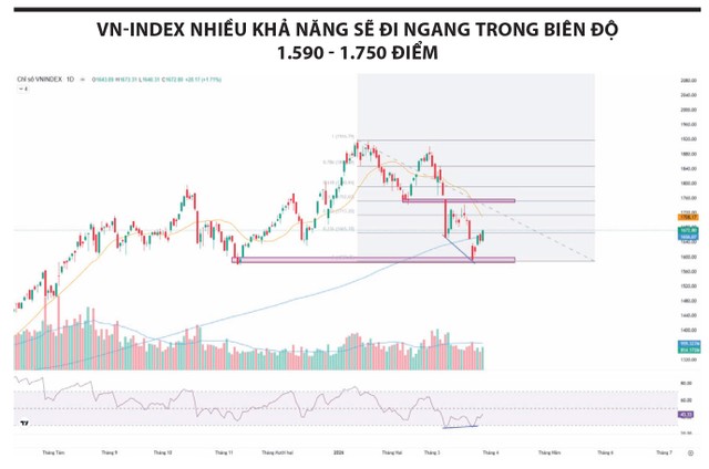 Về dài hạn, xu hướng chính nhiều khả năng là điều chỉnh; vùng 1.590-1.600 điểm là hỗ trợ quan trọng. Nếu vùng này bị phá vỡ, chỉ số có thể lùi về 1.500 điểm – vùng hỗ trợ mạnh trùng đỉnh năm 2022 và tương ứng mức định giá hấp dẫn (P/E khoảng 12 lần), phù hợp cho chiến lược giải ngân dài hạn.