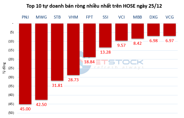 Trái ngược với diễn biến tiêu cực của chỉ số, dòng tiền từ các công ty chứng khoán tiếp tục duy trì trạng thái mua ròng phiên thứ 2 liên tiếp trên sàn HOSE, với giá trị đạt 586 tỷ đồng trong ngày 25/12.
