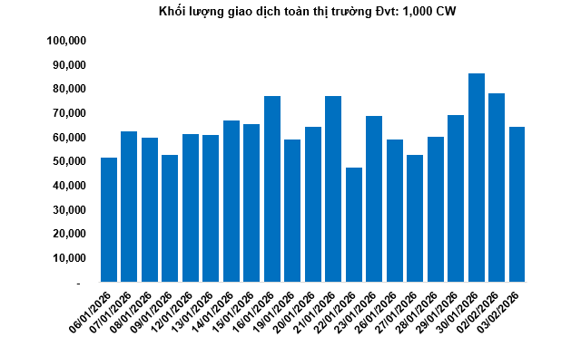 Khối lượng giao dịch toàn thị trường trong phiên 03/02 đạt 64.56 triệu CW, giảm 17.4%; giá trị giao dịch đạt 127.54 tỷ đồng, giảm 24.93% so với phiên 02/02. Trong đó, CACB2502 là mã dẫn đầu thị trường về khối lượng với 7.01 triệu CW; CMWG2520 dẫn đầu về giá trị giao dịch với 6.78 tỷ đồng.