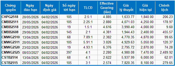 Thị trường chứng quyền ngày 04/02/2026: Thị trường diễn biến phân hóa