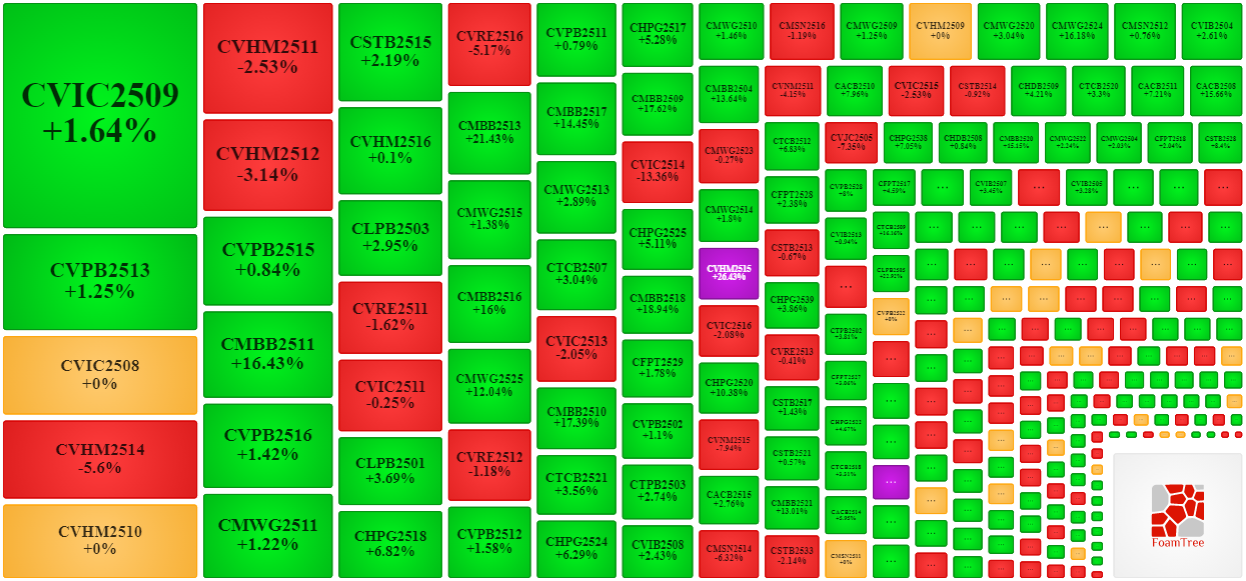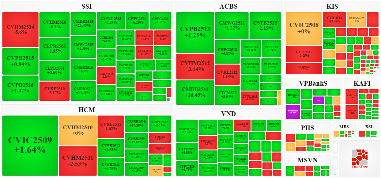 Trong phiên giao dịch ngày 04/12/2025, bên mua tiếp tục dẫn dắt thị trường khiến phần lớn các mã chứng quyền tăng giá. Cụ thể, các mã chứng quyền lớn trong nhóm tăng giá là CVIC2509, CVPB2513, CVPB2515, CMBB2511 và CMWG2511.