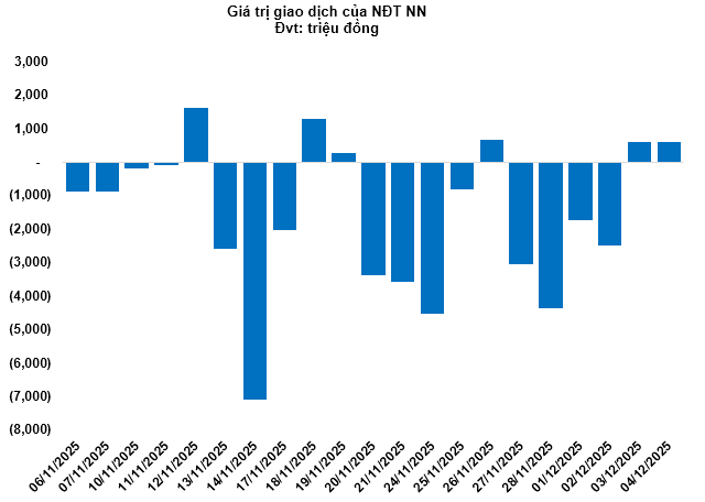 Kết thúc phiên giao dịch ngày 04/12/2025, toàn thị trường có 165 mã tăng, 80 mã giảm và 29 mã tham chiếu. Khối ngoại tiếp tục mua ròng với tổng mức mua ròng đạt 586.54 triệu đồng.