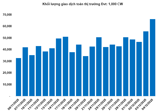 Khối lượng giao dịch toàn thị trường trong phiên 04/12 đạt 66.11 triệu CW, tăng 18.96%; giá trị giao dịch đạt 138.45 tỷ đồng, tăng 19.42% so với phiên 03/12. Trong đó, CMSN2521 là mã dẫn đầu thị trường về khối lượng với 5.61 triệu CW; CMBB2511 dẫn đầu về giá trị giao dịch với 11.38 tỷ đồng.