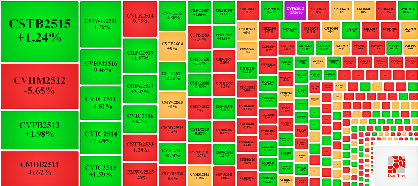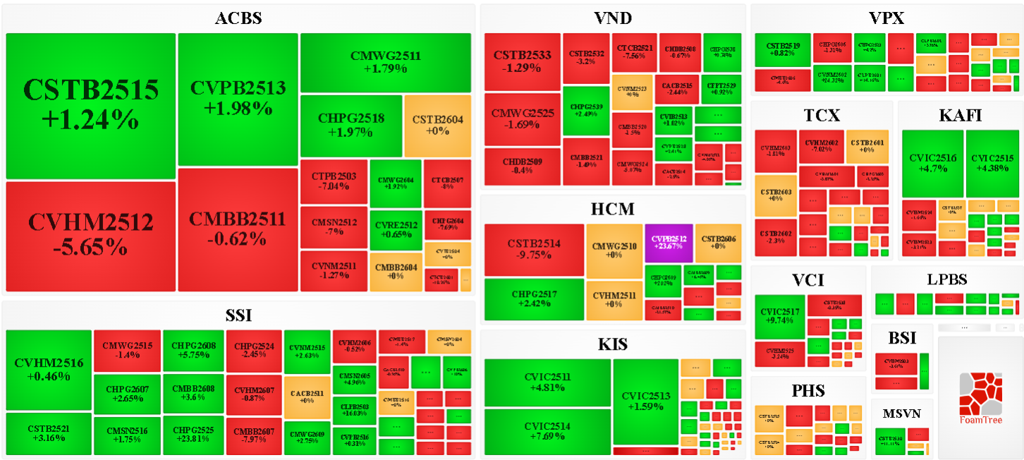 Trong phiên giao dịch ngày 07/04/2026, thị trường diễn biến phân hóa nhưng bên bán có phần lấn lướt hơn khiến phần lớn các mã chứng quyền giảm giá. Cụ thể, các mã chứng quyền lớn trong nhóm giảm giá là CVHM2512, CMBB2511, CSTB2514 và CMWG2525.