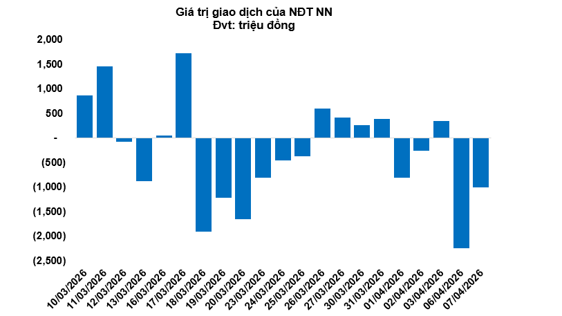 Kết thúc phiên giao dịch ngày 07/04/2026, toàn thị trường có 91 mã tăng, 131 mã giảm và 55 mã tham chiếu. Khối ngoại tiếp tục bán ròng với tổng mức bán ròng đạt 1.01 tỷ đồng.
