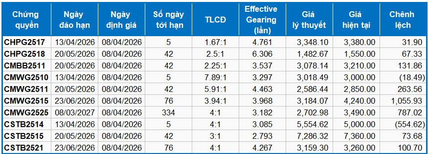 Thị trường chứng quyền ngày 08/04/2026: Thị trường tiếp tục diễn biến phân hóa