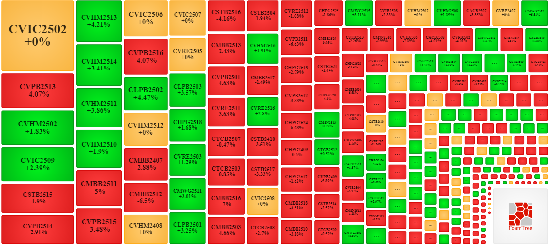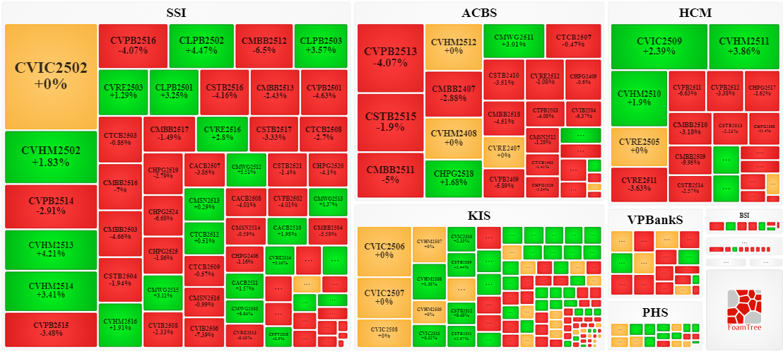 Trong phiên giao dịch ngày 07/10/2025, bên bán quay lại dẫn dắt thị trường khiến phần lớn các mã chứng quyền giảm giá. Cụ thể, các mã chứng quyền lớn trong nhóm giảm giá là CVPB2513, CSTB2515, CTCB2507 và CMBB2511.