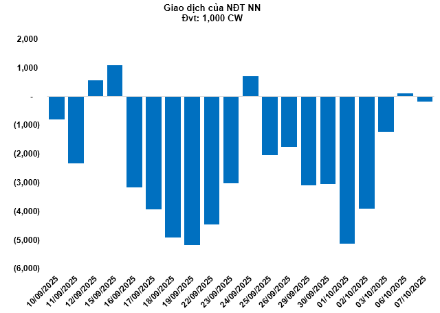 Khối ngoại quay lại bán ròng trong phiên 07/10 với tổng mức bán ròng đạt 177,300 CW. Trong đó, CHPG2526 và CMSN2509 là hai mã bị bán ròng nhiều nhất.