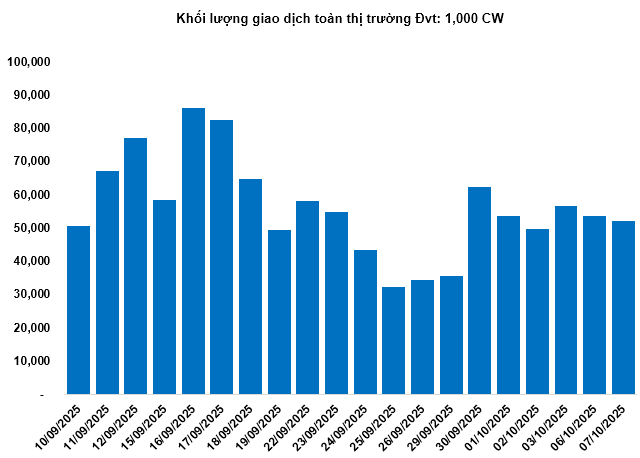 Khối lượng giao dịch toàn thị trường trong phiên 07/10 đạt 51.97 triệu CW, giảm 3.17%; giá trị giao dịch đạt 135.07 tỷ đồng, giảm 5.81% so với phiên 06/10. Trong đó, CMWG2407 là mã dẫn đầu thị trường về khối lượng với 4.58 triệu CW; CSTB2514 dẫn đầu về giá trị giao dịch với 9.4 tỷ đồng.