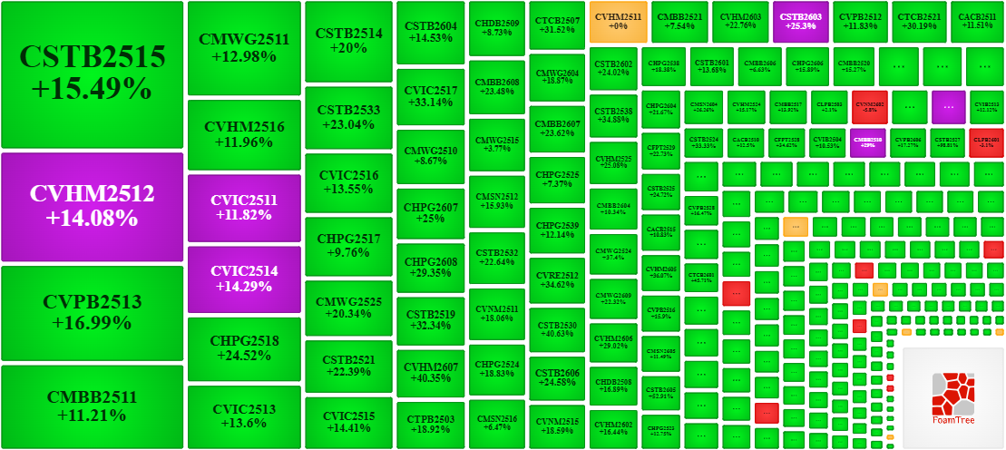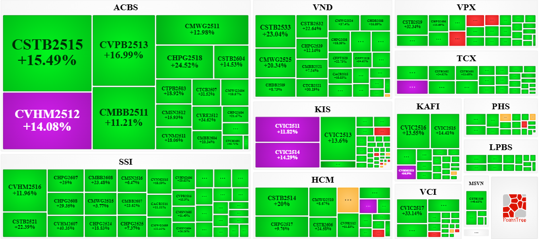 Trong phiên giao dịch ngày 08/04/2026, bên mua quay lại áp đảo thị trường khiến phần lớn các mã chứng quyền tăng giá. Cụ thể, các mã chứng quyền lớn trong nhóm tăng giá là CSTB2515, CVHM2512, CVPB2513 và CMBB2511.