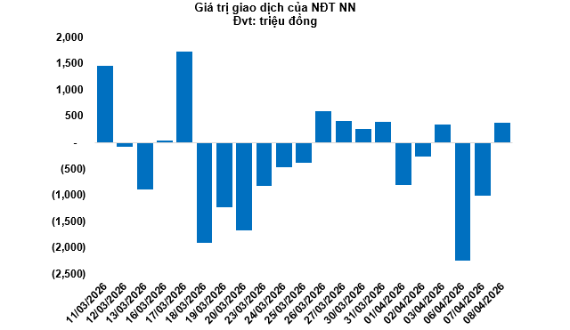 Kết thúc phiên giao dịch ngày 08/04/2026, toàn thị trường có 250 mã tăng, 13 mã giảm và 11 mã tham chiếu. Khối ngoại quay lại mua ròng với tổng mức mua ròng đạt 365.23 triệu đồng.