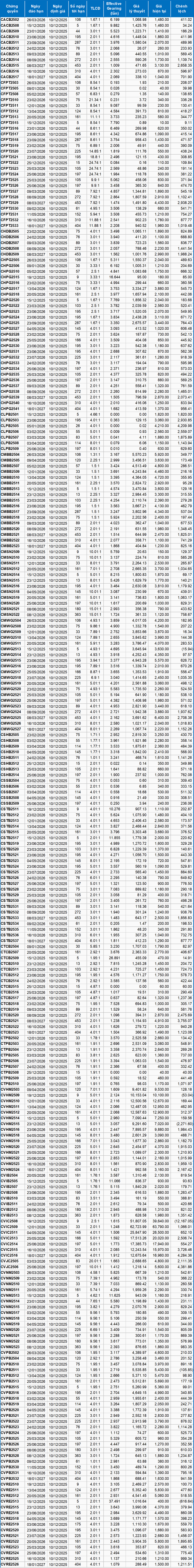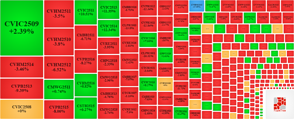 Khối lượng giao dịch toàn thị trường trong phiên 09/12 đạt 59.04 triệu CW, tăng 47.76%; giá trị giao dịch đạt 114.34 tỷ đồng, tăng 18.96% so với phiên 08/12. Trong đó, CTCB2518 là mã dẫn đầu thị trường về khối lượng với 2.9 triệu CW; CMBB2511 dẫn đầu về giá trị giao dịch với 6.82 tỷ đồng.